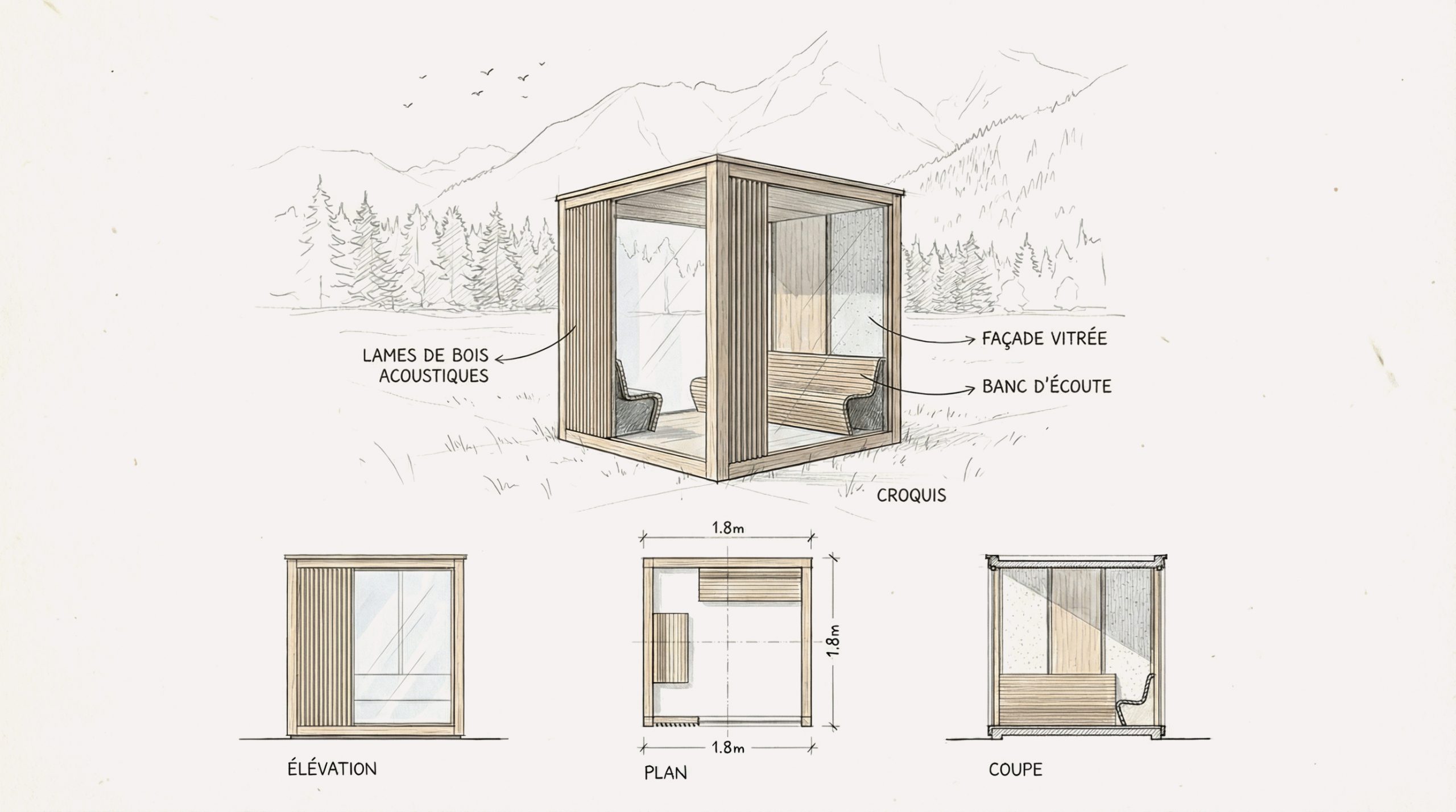 Installées au cœur de paysages naturels, des cabines plongent les visiteurs dans la richesse sonore du monde : chant des oiseaux, vent dans les arbres, bruit de l'eau... Avant que ces sons ne disparaissent progressivement. Une expérience courte mais marquante, qui rappelle l’importance de préserver le son du monde.